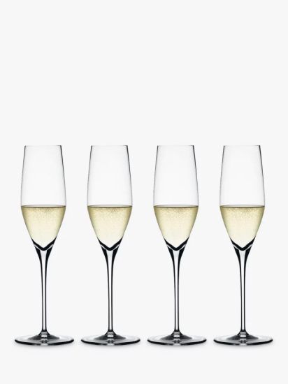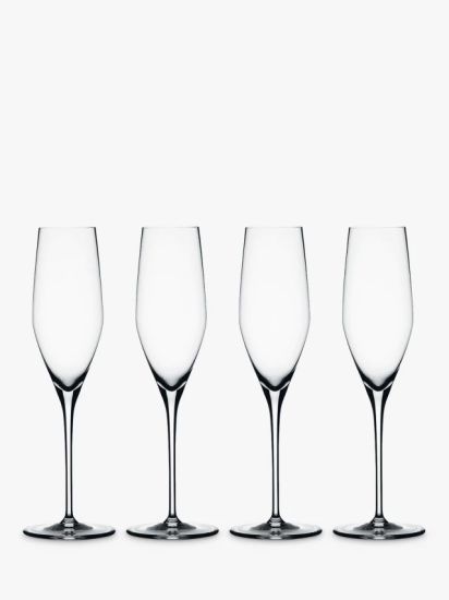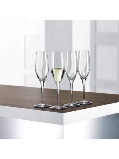 A set of four glassware collection champagne glasses. The shape is perfect for enjoying champagne, prosecco and sparkling wines, and the narrow design retains the bubbles.