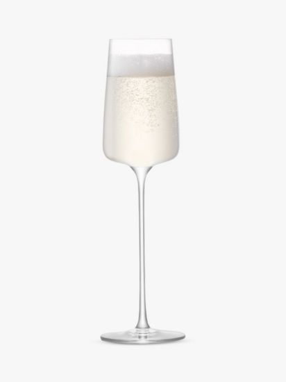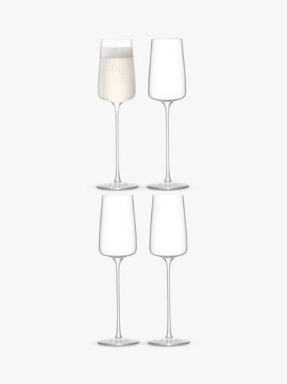 Our glassware collection features modern, angular shapes. This set of four flute-shaped glasses from the collection was made by Polish glassware experts. The long stem keeps the contents of the glass cold. The narrow bowl retains bubbles when you drink champagne, prosecco and sparkling wine. The glassware is dishwasher safe.