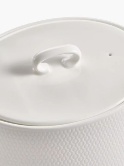 This teapot is crafted from stylish white fine bone china. Each piece features a carefully crafted intaglio texture with the pattern going deep into the surface. The collection is clean and modern and is dishwasher and microwave safe.